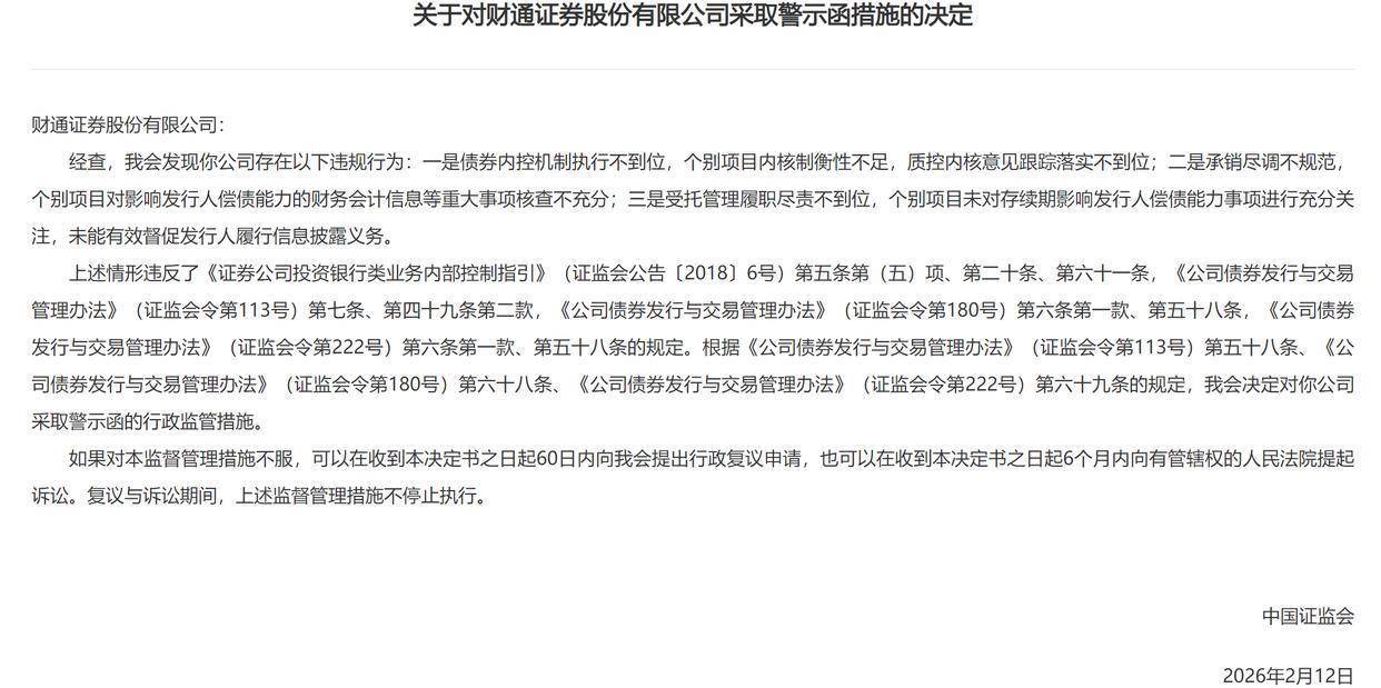 2月13日,证监会发布关于对财通证券股份有限公司采取警示函措施的决定。