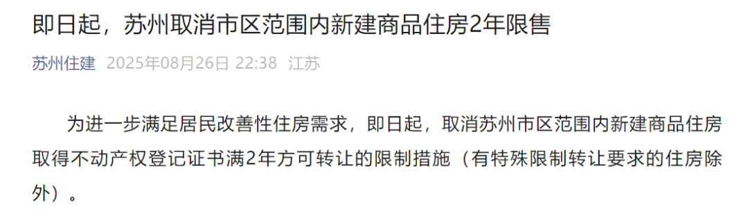 8月26日夜间,江苏苏州取消了市区范围内新建商品住房2年限售政策。