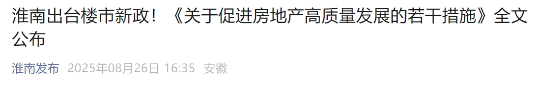 8月26日,据“淮南发布”公众号消息,淮南发布了《关于促进房地产高质量发展的若干措施》,共10条措施。