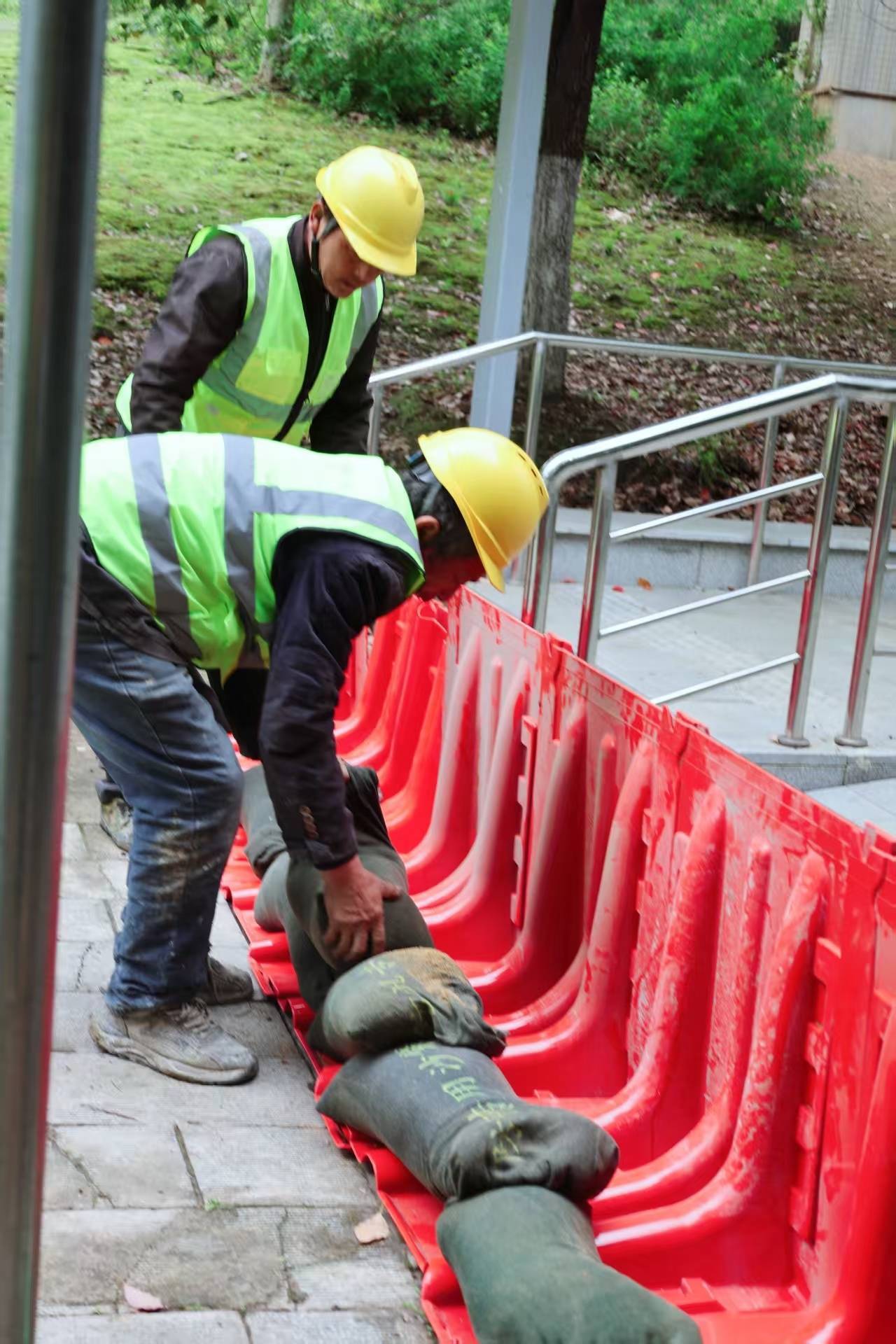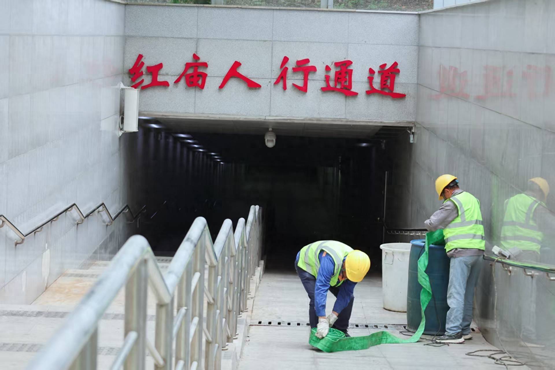演练模拟暴雨天气下,红庙人行通道突发积水险情。现场,巡查人员第一时间发现隐患并上报,随后立即启动应急预案,应急队伍携带沙袋、大功率抽水机、疏涝设备等专业物资,快速抵达现场。