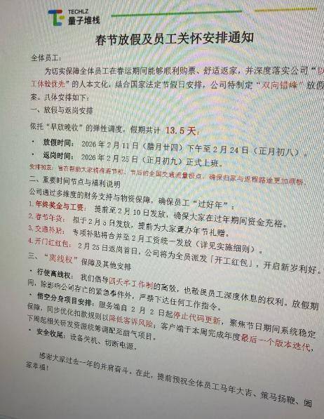 这则署名为量子堆栈的《春节放假及员工关怀安排通知》提到,为切实保障全体员工在春运期间能够顺利购票、舒适返家,并深度落实公司员工体验优先的人本文化。结合国家法定节假日安排,公司特制定“双向错峰”方案,春节放假实施“早放晚收”,假期共计13.5天。从腊月二十四就开始放假,正月初九正式上班。